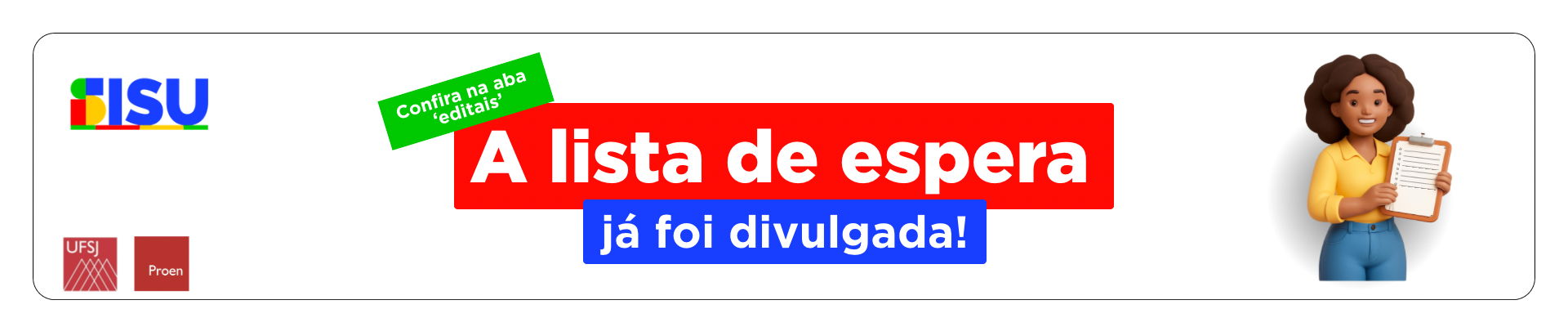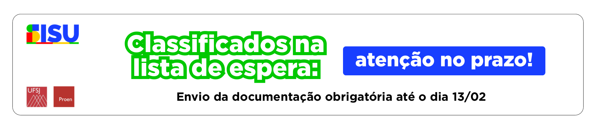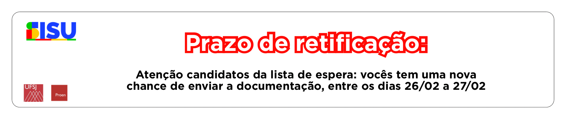 Informamos ainda que a convocação da Lista de Espera do SiSU 2026 já foi publicada e os candidatos convocados serão matriculados automaticamente pela UFSJ no período de 16 a 23 de março, não sendo necessário realizar qualquer procedimento adicional. Após a efetivação da matrícula, os estudantes receberão comunicação no e-mail informado no cadastramento no SIGPS com orientações para acesso ao SIGAA e início das atividades acadêmicas.